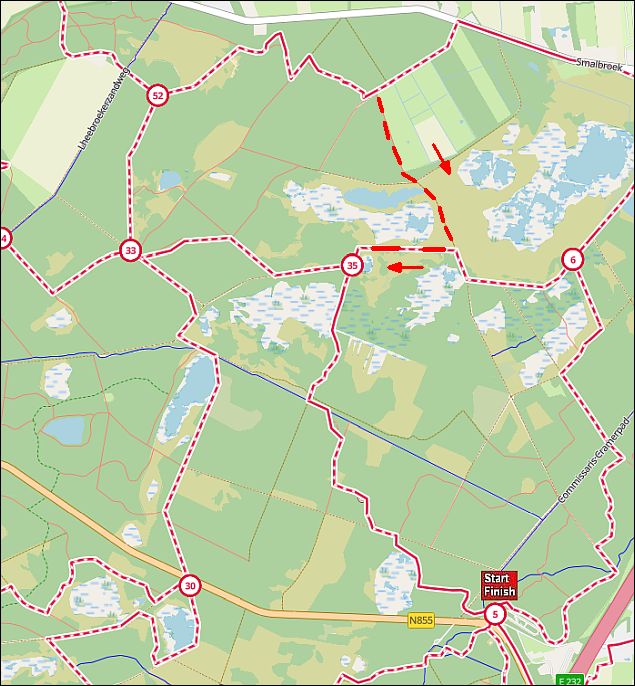 Als je de hele route van 7,6 km zou lopen, heb je te weinig halfopen en open terreindelen.