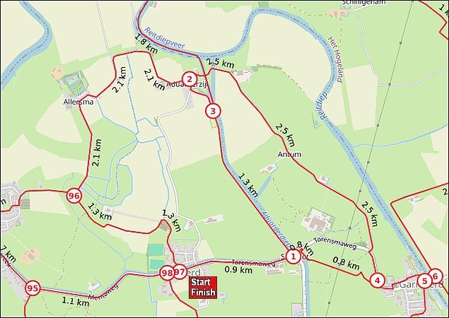 Wandelknooppunten: 16 – 15 – 17 – 18 – 19 – 23 – 14 – 25 – 26 – 28 – 27 – 24 – 16.