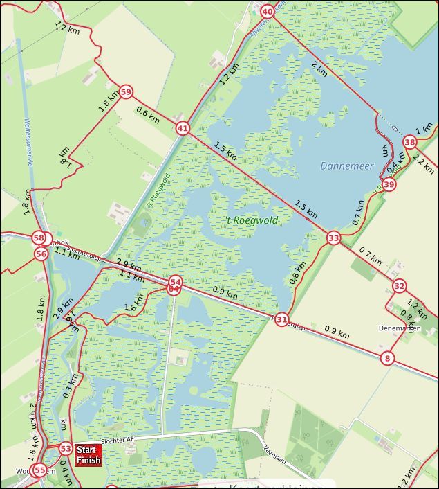 Bovenstaande kaart is voldoende om de route probleemloos te volgen. Desgewenst neem je van een wandelknooppuntenkaart even de knooppunten over.