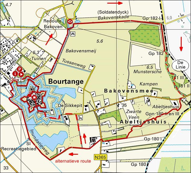 De wandelroute loopt door het voorterrein van de vesting, een gebied dat bij dreiging uit het oosten onder water kon worden gezet. Met sluizen en kades werd – toen het moeras door indroging zijn ondoordringbaarheid verloor – een extra verdedigingslinie aangelegd.