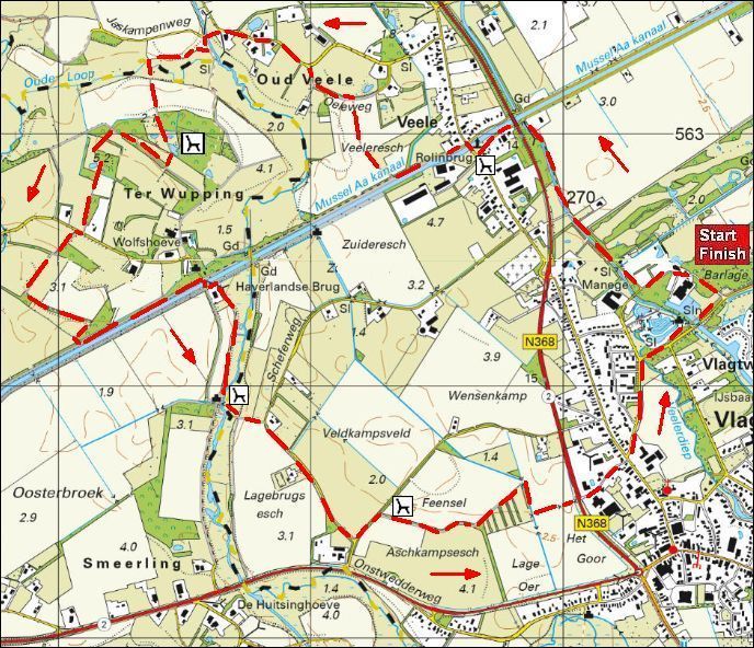 Je komt langs het gehucht Oud Veele en door het kleinschalige landschap Ter Wupping, een eeuwenoud cultuurlandschap. Hier worden lager gelegen graslanden en vennetjes afgewisseld met hoger gelegen, bolle akkers, houtsingels en bosjes. Door deze kleinschalige afwisseling spreekt men ook wel van een kamertjeslandschap.