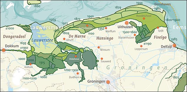 Toen de zeespiegel langzaam steeg, wierp men wierden (kunstmatige woonheuvels) op om droge voeten te houden.