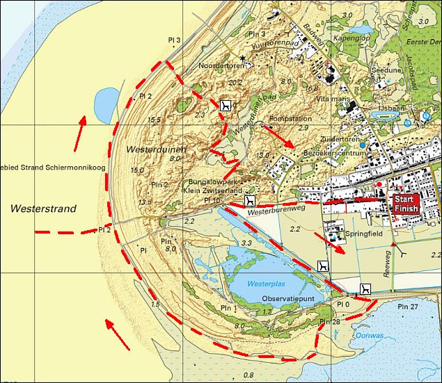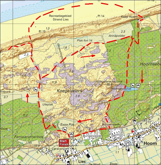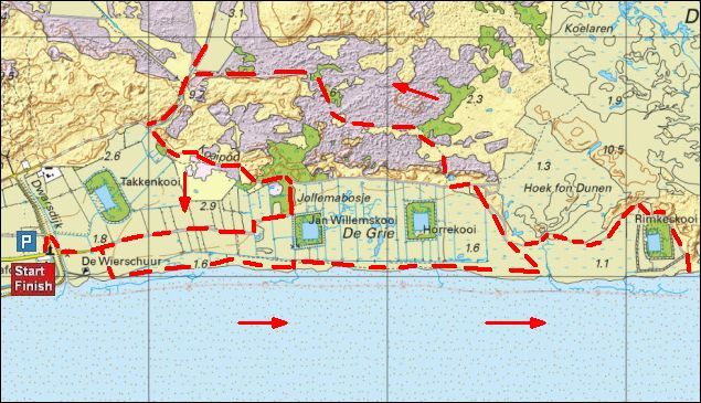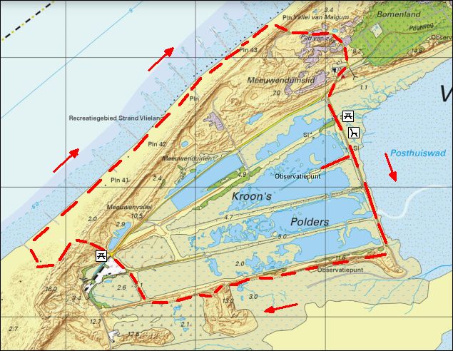De route voert door het meest noordwestelijke punt van Nederland. Je loopt door een afwisselend landschap van bosjes, moerassen en open terrein. De bosjes bieden beschutting, waardoor in de trektijd veel vogels neerstrijken. Soms hebben ze na een lange vlucht eindelijk vaste grond bereikt, soms ontdekken ze hier dat het land ophoudt en de open zee begint. Regelmatig worden dan ook bijzondere soorten waargenomen.