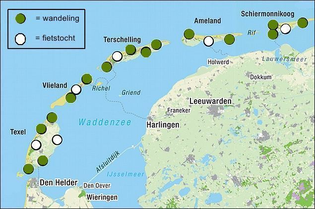 Voor de indeling van de wandelingen gebruik ik vanzelfsprekend de 5 Waddeneilanden, zoals je in het groene kader hierboven ziet.