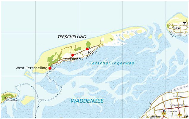 De kleine ‘hoofdstad’ van het eiland is West-Terschelling. Dit relatief grote dorp heeft ca. 2600 inwoners. Het is omgeven door duinen en kijkt uit over de Waddenzee. Hier ligt ook de veerhaven.